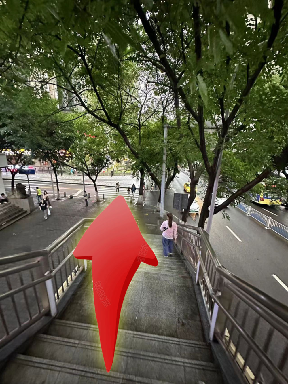 重庆西站:地铁5号线(西站地铁站上车;石桥铺方向)  石桥铺站下车(站内换乘1号线,朝天门方向) → 七星岗站下车(1A口出站)